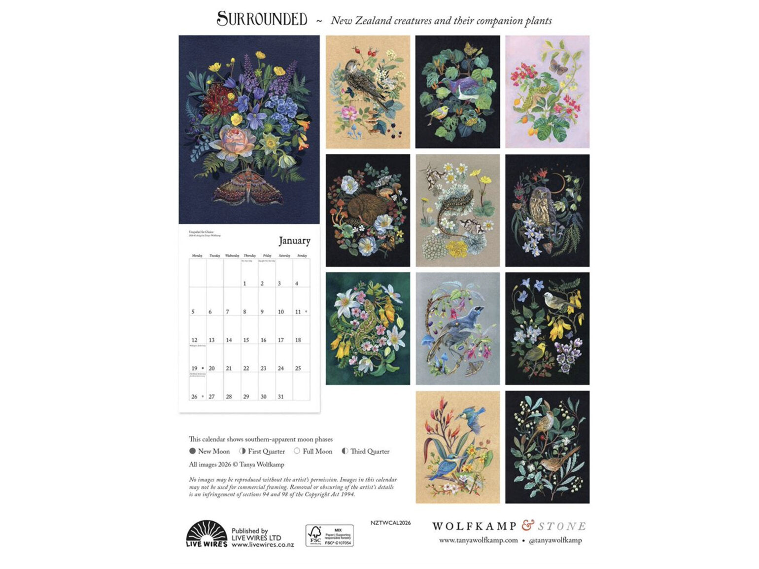 Tanya Wolfkamp’s 2026 wall calendar ‘Surrounded’ is filled with stunning detailed artwork show casing New Zealand creatures & their companion plants.