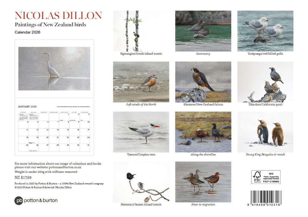 This calendar features the artwork of one of New Zealand’s leading wildlife painters, Nicolas Dillon.
