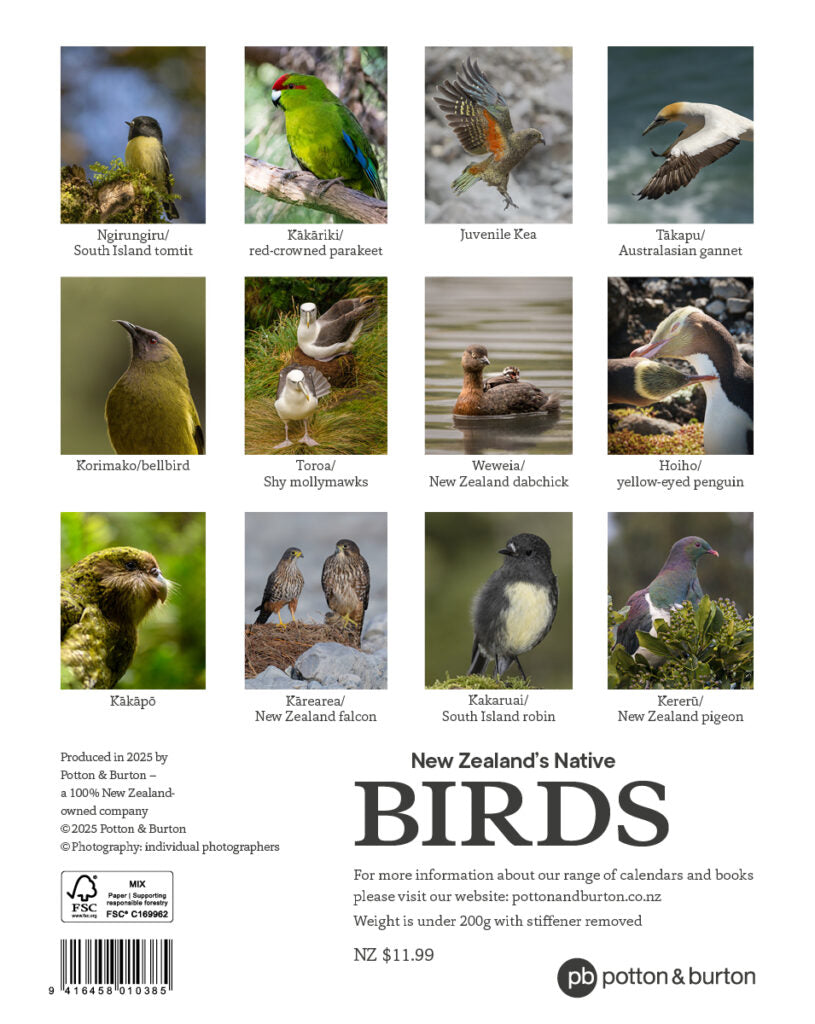 A popular small format wall calendar featuring an intriguing array of birdlife which inhabit areas in and around New Zealand, Antarctica and the subantarctic islands. These images captured by New Zealand's leading natural history photographers, highlight the unique birdlife that dwells in our natural world.